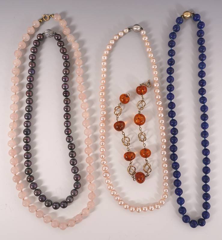 Konvolut Ketten Ein Armband mit Bernstein und Gold 333 (punziert), sowie zwei Stein- und zwei Perlenketten mit Goldverschlüssen, punziert 585. Maximale Länge ca. 52 cm.