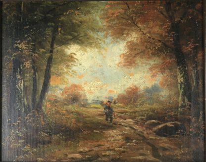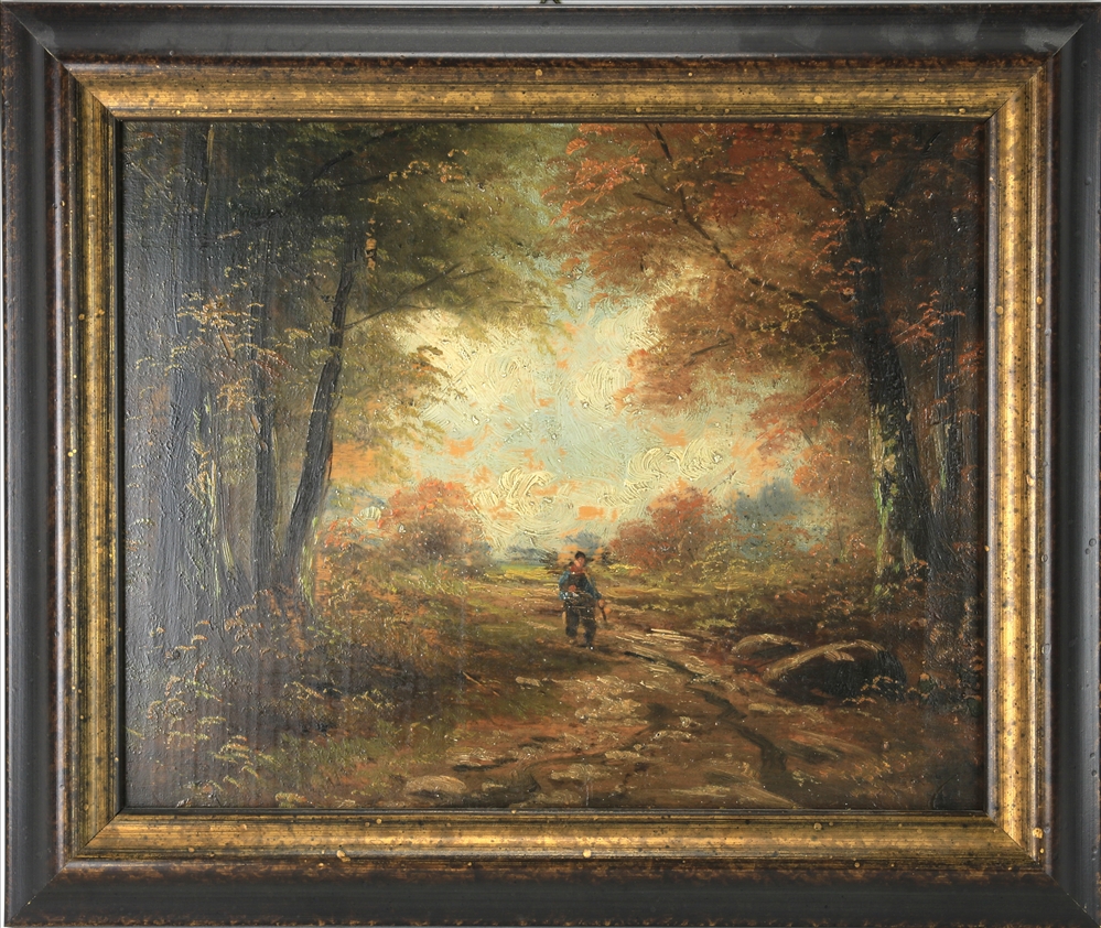 Wohl deutsch, 19. Jahrhundert. Jeweils eine Figur umgeben von Bäumen. Öl auf Platte. Eines links unten unleserlich signiert. Größe jeweils ca. 22,3 x 28,2 cm, Rahmen jeweils ca. 30,2 x 30 cm. Guter Zustand.