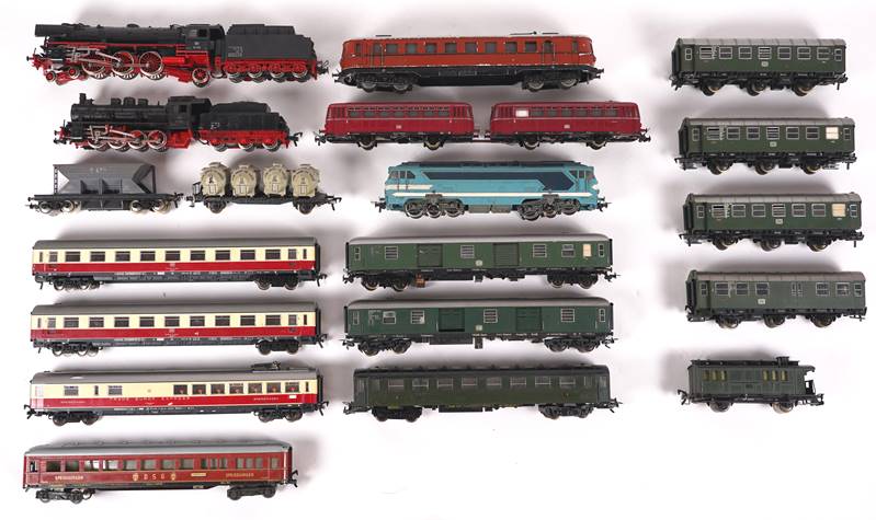 Zwei Dampfloks H0 mit Tender, 01220 und 552875. Eine Lok SNCF 68001. Schienenbus 4400 mit Beiwagen. Ca. 4 Personenwagen 87935. Speisewagen Trans Europ Express. 2 Personenwagen Gruppe 53. DSG Speisewagen. 2 Gepäckwagen 106096. Schotterwagen E433. Behältertragwagen 015204. Eine weitere Lok sowie ca. 2 diverse Personenwagen. Zustand wie abgebildet, bitte selbst besichtigen. Nicht geprüft.