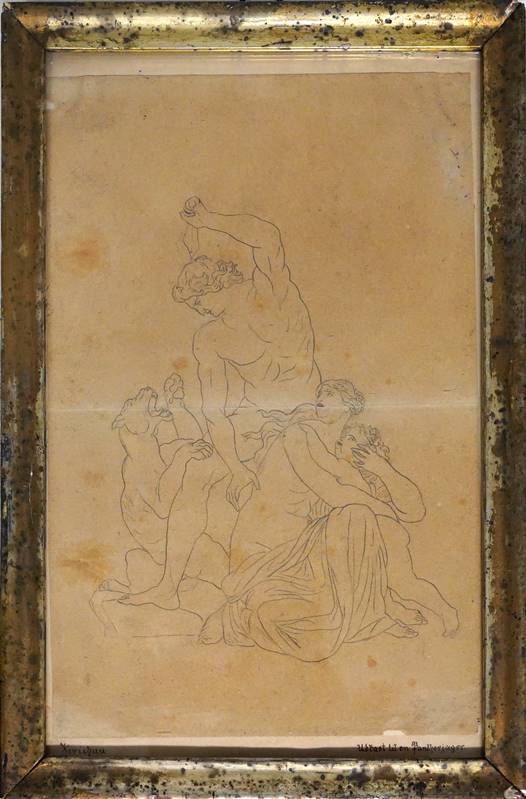 Jerichau, Jens Adolf Emil 1890 Roskilde - 1916 Paris. Kampf mit dem Panther. Bleistiftzeichnung auf Papier. Rechts unten signiert. Auf Trägerpapier bezeichnet. Größe ca. 22 x 14 cm, Rahmen ca. 26,5 x 17,5 cm. Mittig Bugfalte.