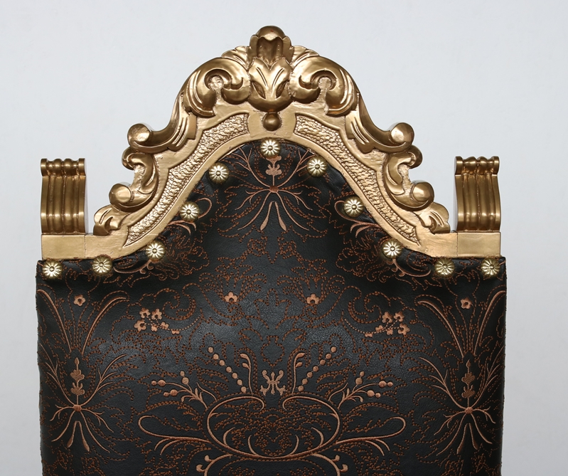 Stil Louis XIV, Frankreich 20. Jh. Holz geschnitzt und goldfarben gefasst. Insgesamt vier Stück. Neu gepolstert und mit gewebtem Skaileder exclusiv bezogen. Größe ca. 45 x 45 cm, Höhe ca. 124 cm, Sitzhöhe ca. 50 cm.