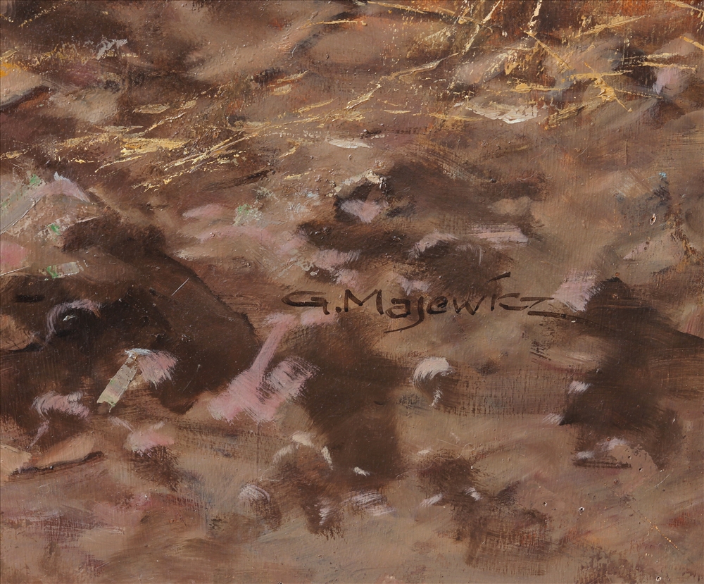 1897 Polkwitz/Tschechien - 1973 Münchberg. Giraffen in der tansanischen Serengeti mit dem Kilimandscharo im Hintergrund. Öl auf Platte. Unten rechts signiert. Größe ca. 120 x 172 cm, der originale Holzrahmen ca. 146 x 199 cm. Dieses kapitale, imposante Gemälde, welches die Stimmung in der Steppe hervorragend wiedergibt, ist mit Sicherheit nach der ausgedehnten Reise von Majewicz durch Tansania im Jahr 1962 in Berlin entstanden.