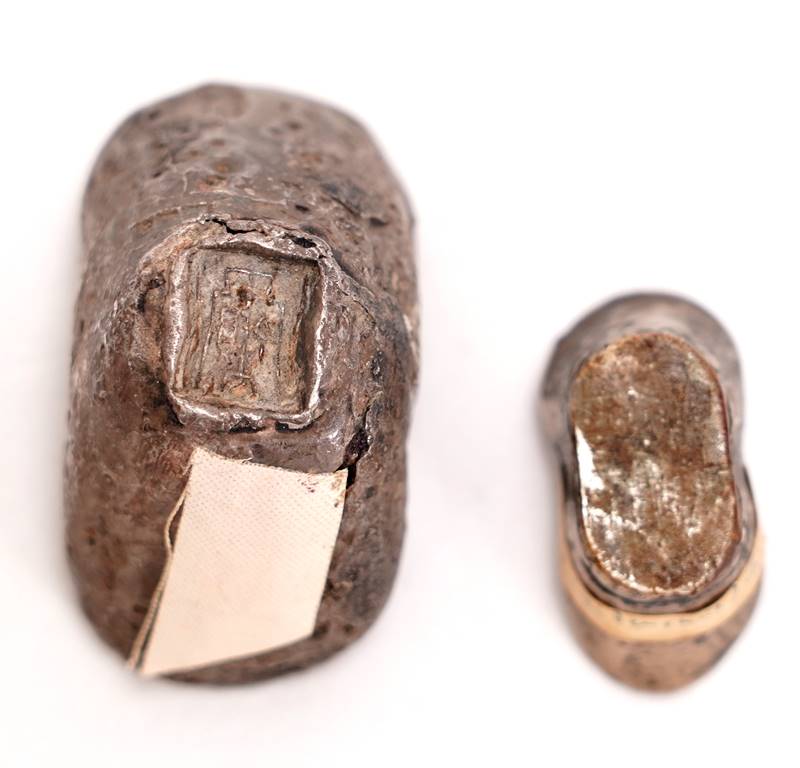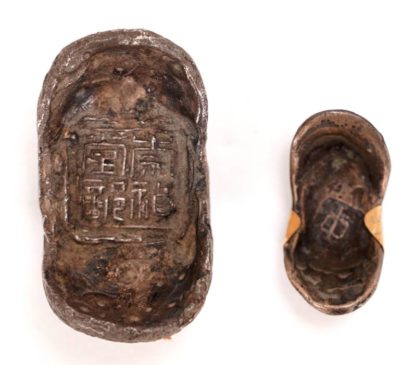 2 Sycee China China. Sycee bzw. Yuan Bao. Wohl Silber, nicht geprüft. Chinesischer Silberbarren in Boot-Form. Jeweils mit Pressmarke. Gewicht ca. 32,9 Gramm und 120,5 Gramm.