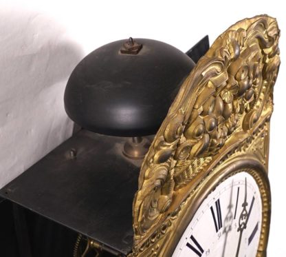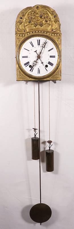 Reliefiertes, goldstaffiertes Messingblech, oben schließend mit Obstkorb. Emailliertes Ziffernblatt mit römischen Stundenzahlen und arabischen Kalendertagen. Achttage-Messingräderwerk mit Ankerhemmung, faltbares Pendel und zwei Gewichten, Schlag zur vollen und halben Stunde auf oben liegende Glocke. Größe ca. 25 x 14 cm, Höhe ca. 40 cm. Uhrwerk läuft bei uns durch, Datumszeiger läuft mit, Schlag löst aus und schlägt. Kurbel anbei. Blech teils eingerissen und berieben.