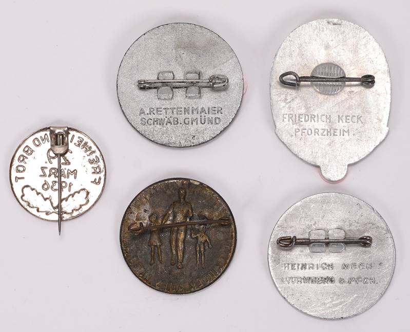 3 x Abzeichen Tag der Arbeit Deutsch 3. Reich. Metall. Abzeichen zum 1. Mai aus den Jahren 1935, verso Hersteller Friedrich Keck Pforzheim, 1936, verso Hersteller Heinrich Meeh Würmberg b. Pfzh, und 1938, verso Hersteller A. Rettenmaier Schwäb. Gmünd. Dazu ein Abzeichen NS-Volkswohlfahrt Kinder aufs Land 1934 und eine Freiheit und Brot 29. März 1936 Nadel. Maximale Größe ca. 46 x 34 mm.