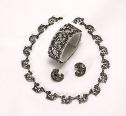 Trachtenschmuck Set Silber 835. Eine Kette, ein Armband und ein Paar Ohrclips mit Akanthusdekor. Je punziert. Länge der Kette ca. 42 cm, Länge des Armbands ca. 18,5 cm, Gesamtgewicht ca. 97 Gramm. Altersbedingter Zustand wie abgebildet.