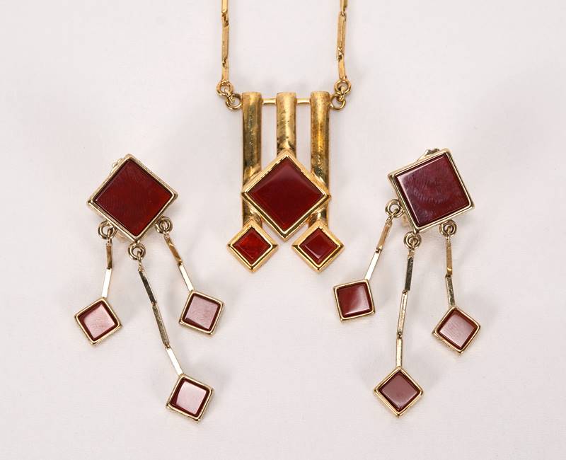 Wien 20. Jh. Elisabeth Koller im Art Deco Stil nach Vorbild Wiener Werkstätten. American Doublé. Eine Stäbchenkette mit Coliier mit drei roten, rautenförmigen Steinen, ein Armband mit rechteckigen, roten Steinen und quadratischen Strasssteinen und ein Paar Ohrstecker mit Behang und rautenförmigen roten Steinen. Je punziert AD, auf den Ohrstecker bezeichnet art deco by e. koller handmade in austria. Länge der Kette ca. 44 cm, Länge des Armbands ca. 19 cm, Gesamtgewicht ca. 61 Gramm.