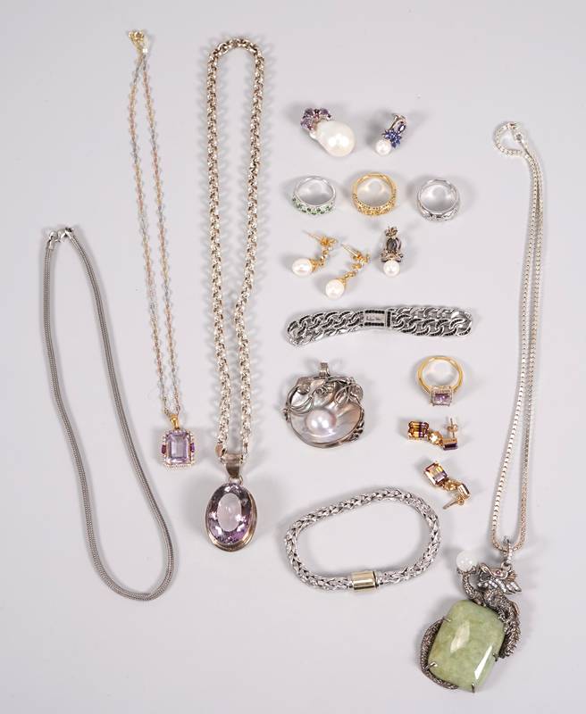 Konvolut Silberschmuck Silber 925, teils vergoldet. Vier Ketten, teils mit Anhängern mit verschiedenem Besatz, zwei Armbänder, vier Ringe, ein Anhänger, drei Paar Ohrhänger. Je punziert. Gesamtgewicht ca. 227,9 Gramm. Anbei ein weiterer Anhänger.