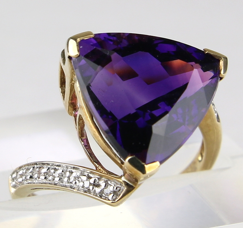 20. Jh. GG 375 punziert (9K). Glatte Schiene, oben mit Diamanten von zusammen ca. 0,04 Carat eingelegt, dreieckiger Kopf und großem Stein von ca. 4,54 Carat. Ringgröße ca. 17 bzw. 54, Gewicht ca. 4,2 Gramm. Schmuckpass anbei.