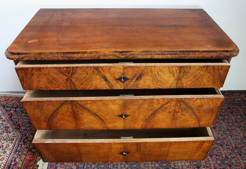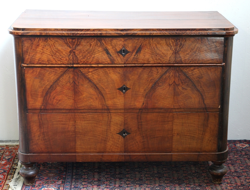 Biedermeier Kommode Deutsch frühes 19. Jh. Nussbaum. Dreischubiger Korpus mit abgerundeten Ecken auf gedrechselten Füßen, leicht überkragende Platte. Größe ca. 115 x 59 cm, Höhe ca. 87 cm.