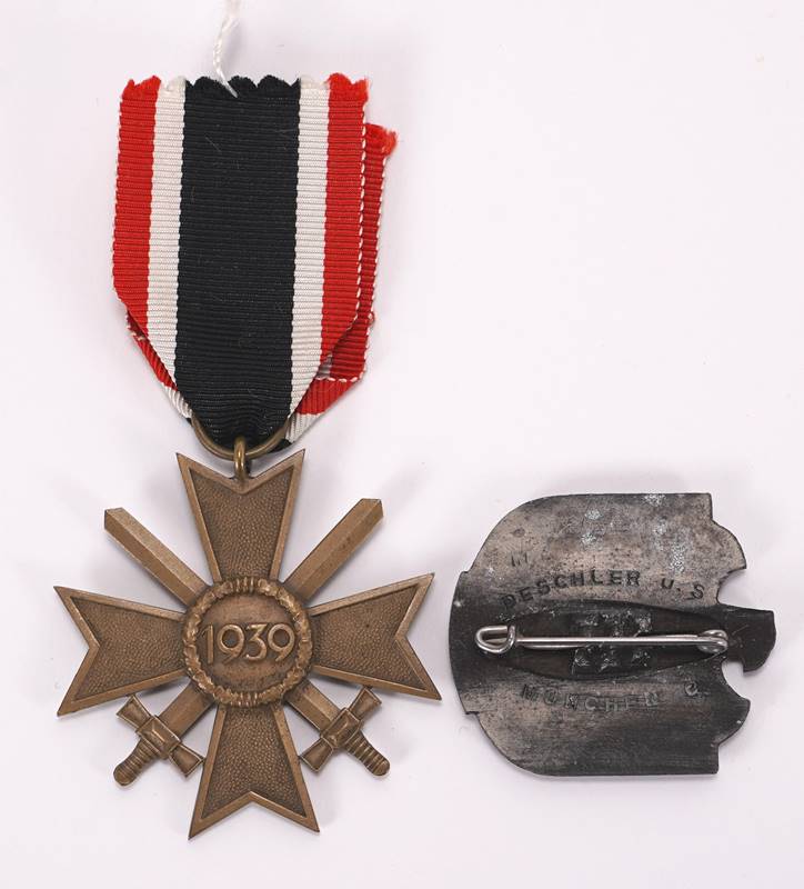 Kriegsverdienstkreuz Deutsch WK II. Mit Schwertern, am Band. Größe ca. 47 x 47 mm. Dazu ein NSKOV Abzeichen. Zink, zum Anheften. Größe ca. 3,5 x 4 cm.