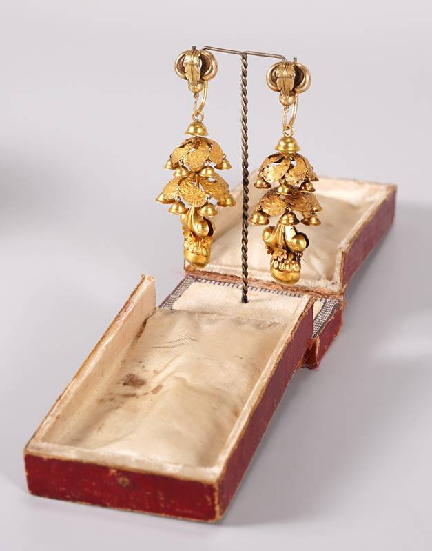 Antikschmuck wohl um 1900 wohl aus Österreich/Ungarn. Gold 585, undeutlich punziert. Paar lange Ohrhänger mit verschiedenen Ebenen und mehreren Pampeln in unterschiedlicher Motivik. Länge ca. 65 mm, Gewicht zusammen ca. 11,2 Gramm. Originale alte Schatulle mit Präsentationsvorrichtung. Schöner Zustand wie abgebildet.