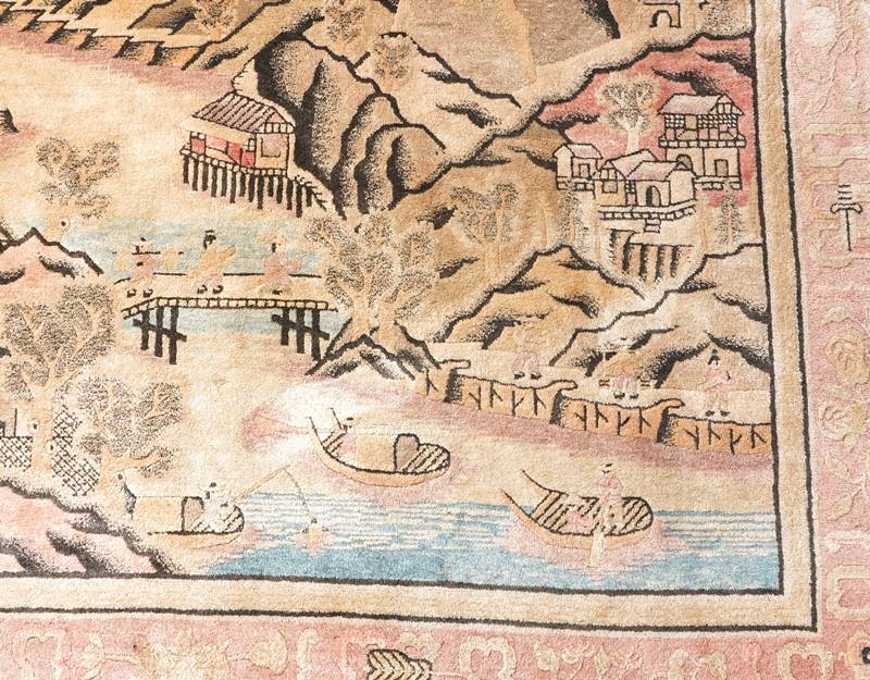 Chinesischer Teppich China, Baotou um 1920. Wolle. Bordüre mit Landschaftsdarstellung im Innenfeld. Größe ca. 165 x 240 cm, ca. 9 Knoten/qcm. Gewicht ca. 11 kg. Altersbedingter Zustand, teils Brandflecken. Mit Bordüre zum aufhängen.