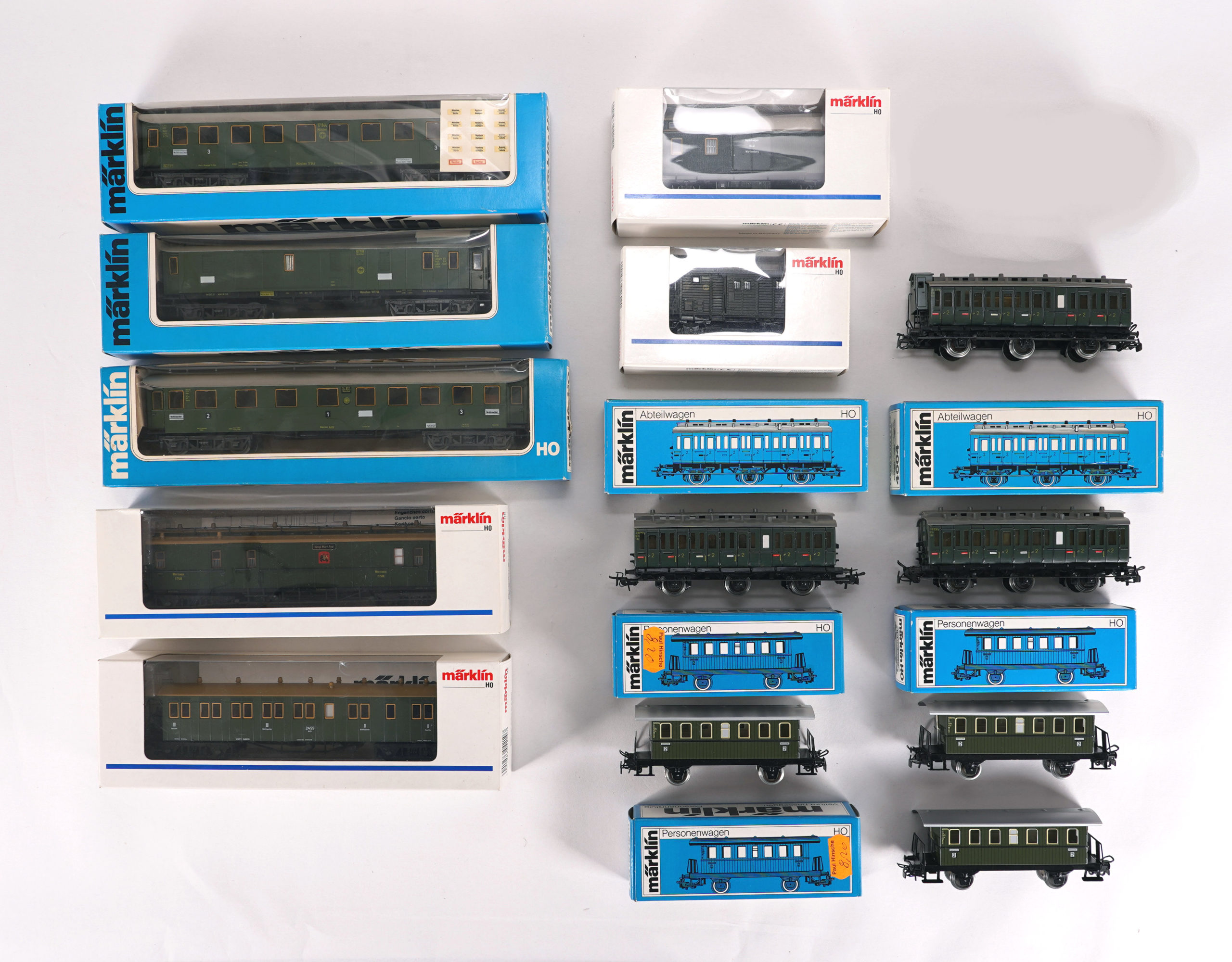 3 x Abteilwagen, 4004 (2 in OVP), 3 x 4040, je einmal zwei-achsig, 4143, 4136 und 4137, sowie 4210 und 4229 und 2 Gepäckwagen 4212 und 4699. Jeweils in OVP. Zustand wie abgebildet, bitte selbst besichtigen.