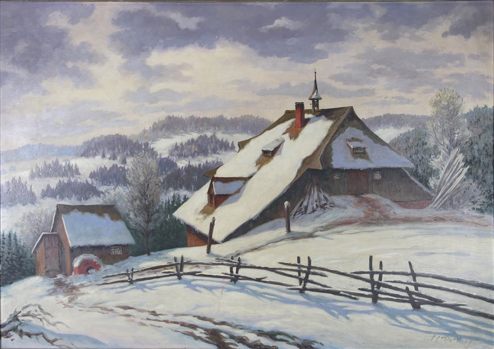 1884 Stetten/Schwarzwald - nach 1932 Freiburg. Winter im Schwarzwald. Öl auf Platte. Unten rechts signiert. Größe ca. 50 x 70 cm, Rahmen ca. 61 x 81 cm. Platte etwas wellig.
