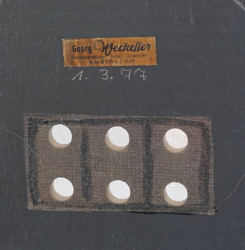 20. Jh. Ebonisierter, quaderförmiger Korpus mit rundem Giebelabschluss auf vier goldfarbenen Füßen. Dreiseitige Verglasung. Geprägtes Metallziffernblatt mit römischen Stundenzahlen und arabischer Minuterie. Unter der Zwölf bezeichnet. Messingplatinenwerk mit Federaufzug, obenliegender Unruhe und Schlag auf vier Tonstäbe. Auf dem Werk Herstellerbezeichnung und Werknummern 700.81 und 75. Größe ca. 26 x 13 cm, Höhe ca. 35,5 cm.