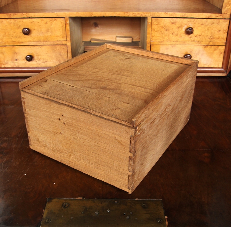 Biedermeier Sekretär Deutsch frühes 19. Jh. Nussbaum. Dreischubig mit Schreibklappe und Kopfschublade. Geschrägte Ecken und getrepptes Gesims. Reiches Innenleben mit sieben Schubladen und zentralem Fach aus Vogelaugenahorn. Größe ca. 95 x 46 cm, Höhe ca. 155 cm.