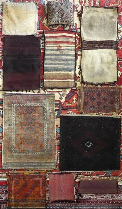 Konvolut Belutsch 20. Jh. verschiedene Materialien. 11 diverse kleine Teppiche bzw. teilweise auch Taschen bzw. Zeltdekorationen. Größter Teppich ca. 102 x 66 cm. Unterschiedliche Zustände. Bitte selbst besichtigen.