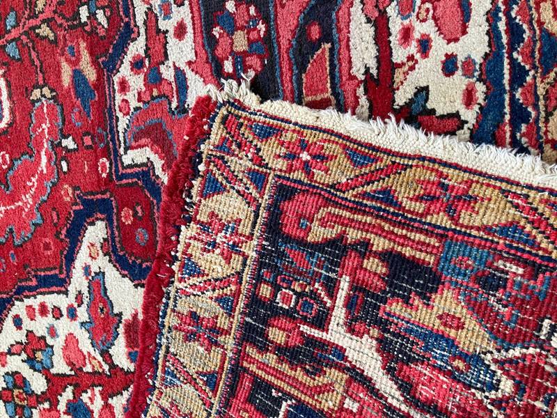 Heriz 2. Hälfte 20. Jh. Baumwolle. Drei Bordüren und Medaillon im Spiegel mit Eckzwickeln. Größe ca. 435 x 300 cm, ca. 6 Knoten/qcm. Teils abgelaufen, teils Farbverlust.