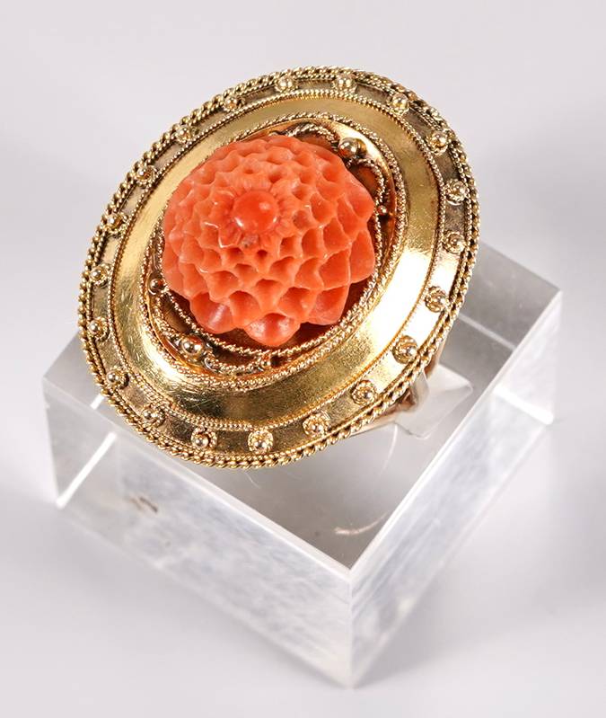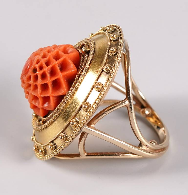 GG 750 (nicht punziert, geprüft). Auf medaillonförmigem Ringkopf geschnittene Korallenrose. Ringgröße ca. 61, Gewicht ca. 14,3 Gramm.