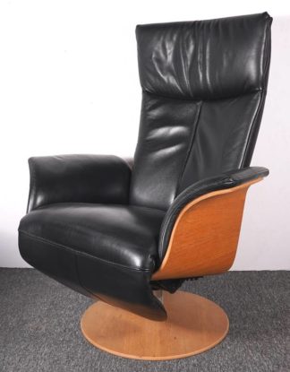 Hjort Knudsen Dänemark 20. Jh. Relaxsessel 5039. Schwarzes Leder in Holzschale, auf rundem Holzfuß. Drehbar, Lehne verstellbar, Fußteil ausklappbar. Rechts mit Herstelleretikett. Größe ca. 85 x 70 cm, Höhe ca. 111 cm, Sitzhöhe ca. 48 cm.