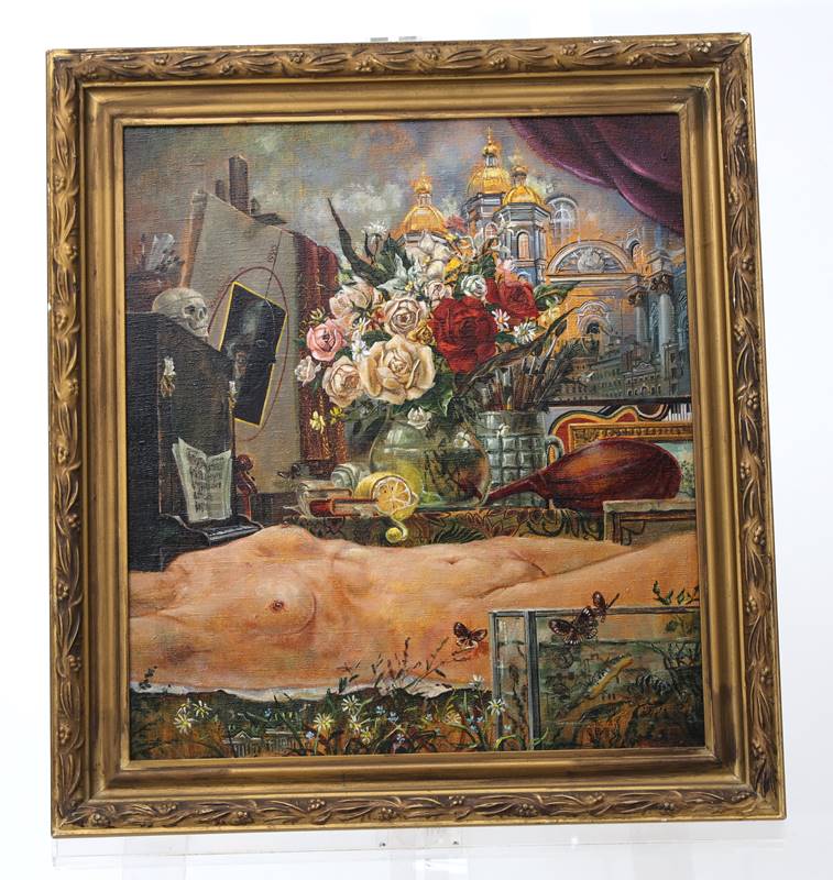 Zhavoronkov, Evegnij Mihajlovitsch 1948 Leningrad. Stillleben mit Akt. Öl auf Leinwand. Oben links sowie verso signiert und datiert 1990. Größe ca. 56 x 50 cm, Rahmen ca. 67 x 60 cm.