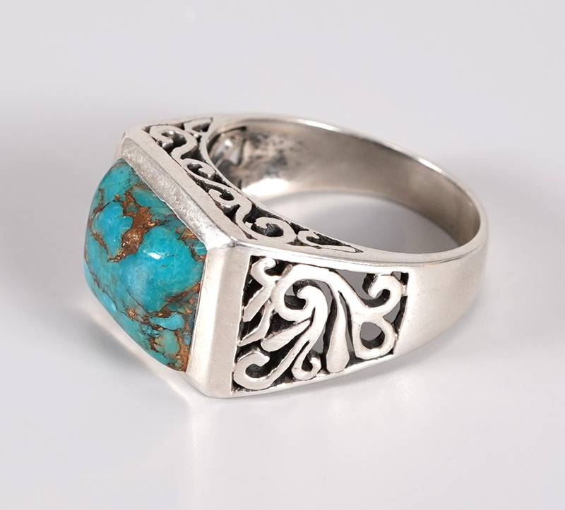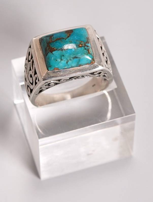 Herrenring Silber 925. Rechteckiger Türkis auf durchbrochen gearbeitetem Ringkopf im floralen Dekor. In der Ringschiene punziert. Ringgröße ca. 70, Gewicht ca. 12,9 Gramm.