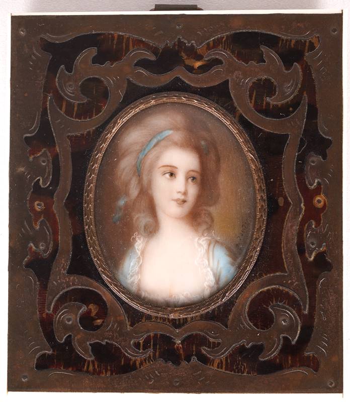 Miniaturporträt 19. Jh. Porträt der Grafin Potocka. Gouache. Unten rechts unleserlich signiert. Verso bezeichnet. Größe ca. 5 x 4 cm, hinter Glas in einem Rahmen mit Metallintarsien ca. 9 x 8 cm.