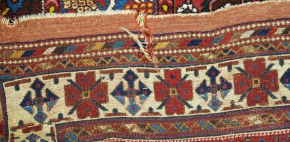 Shiraz Frühes 20. Jh. Dreifachbordüre mit zentralem Medaillon auf rotem, durchgemustertem Innenfeld. Größe ca. 170 x 130 cm, ca. 4 x 4 Knoten/qcm. Altersbedingter Zustand wie abgebildet, abgetreten mit Löchern.