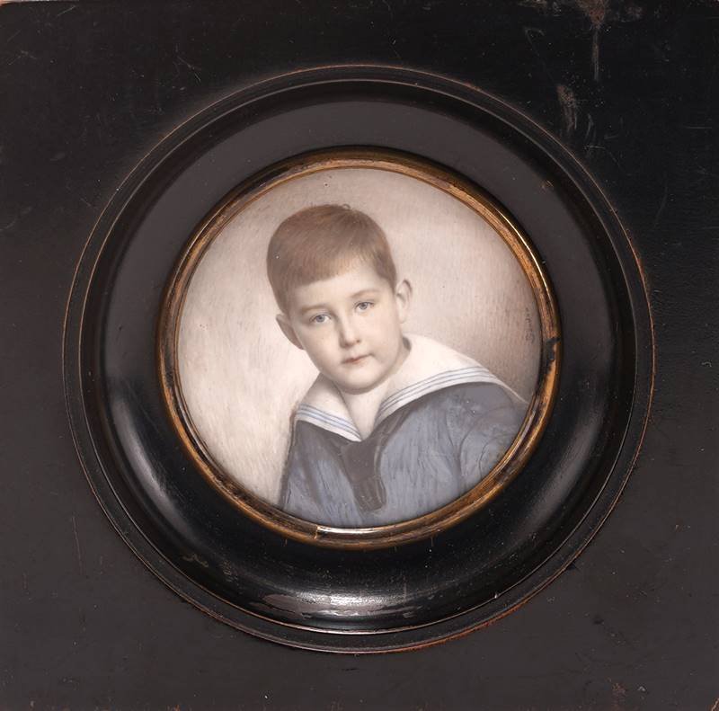 Miniaturporträt Deutsch um 1900. Porträt eines Jungen im Matrosenanzug. Gouache. Unten rechts signiert Sandau. Durchmesser ca. 6 cm, hinter Glas in einem ebonisiertem Holzrahmen ca. 12 x 12 cm.
