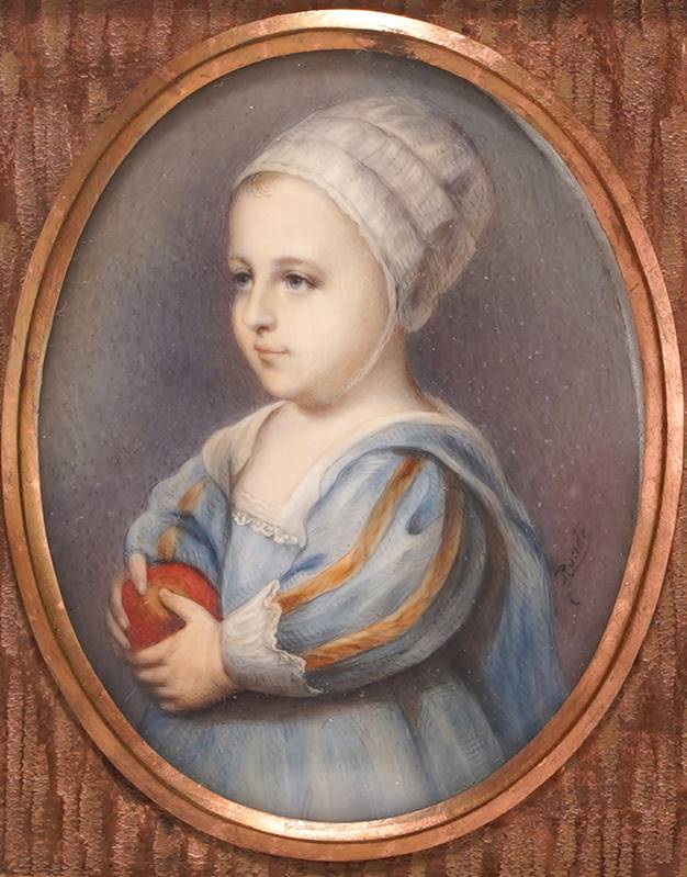 Miniaturporträt Frankreich 19. Jh. Porträt eines Kindes mit Apfel. Gouache. Unten rechts signiert Rondé. Größe ca. 8,5 x 7 cm, hinter Glas gerahmt ca. 12 x 10 cm.