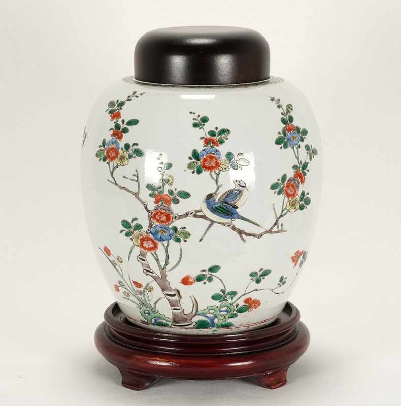 Ginger pot. China probably 18th c. Porcelain famille verte with wooden lid and base. Six little birds, two of them flying and four sitting on a branch with green leaves and blue and red blossoms. Upper rim finished with an ornamental band. Under the bottom label of the renowned trading company John Sparks, which was founded in 1890 and specialised in trading Japanese and Chinese art. Diameter approx. 23 cm, height without base approx. 25 cm. Lid probably of more recent date.