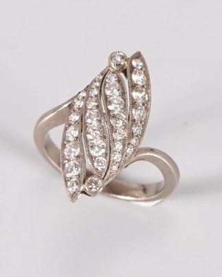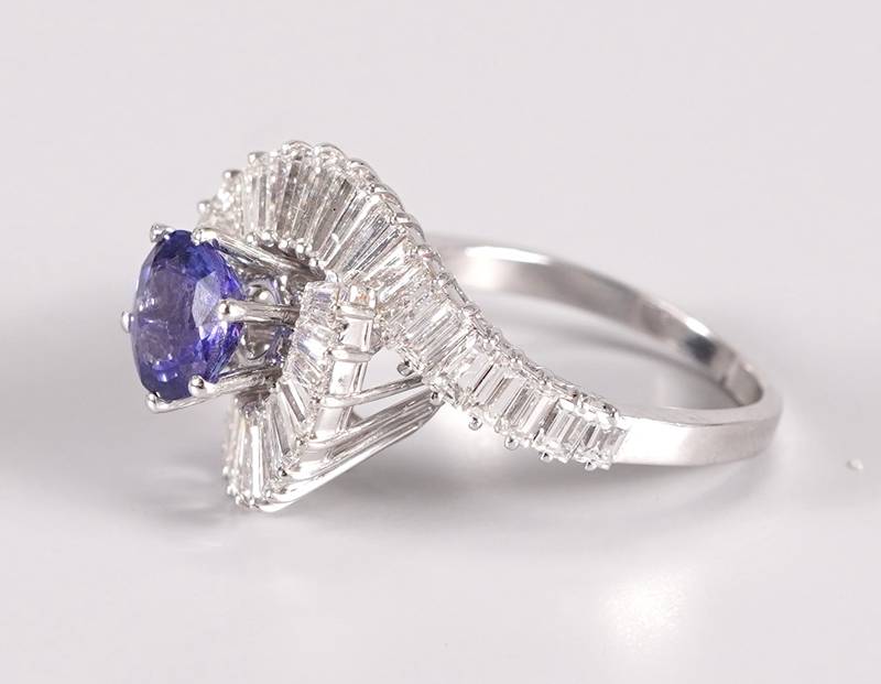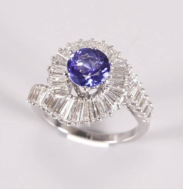 Weißgold 750 (nicht punziert). Zentraler, violetter Tansanit (ca. 1,35 Carat laut Etikett), umgeben von zwei geschwungenen, gegenläufig angeordneten, getreppten Strängen besetzt mit Diamantstäben (zusammen ca. 3,5 Carat, TW-F, VVS laut Etikett). Ringgröße ca. 54, Gewicht ca. 5,7 Gramm. Die strahlenförmige Diamantfassung bringt den farbstarken Mittelstein besonders zum leuchten und macht diesen Ring zum luxuriösen Schmuckstück mit außergewöhnlicher Präsenz.