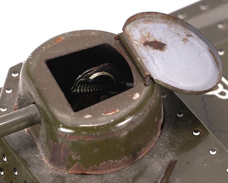 Konvolut Blechspielzeug Joustra, Panzer Tchad, France. Kellermann, Penny Toy Beiwagenmotorrad K-342, Germany. Ein Raupenband fehlt. Motorrad teils beschädigt. Bitte selbst besichtigen.