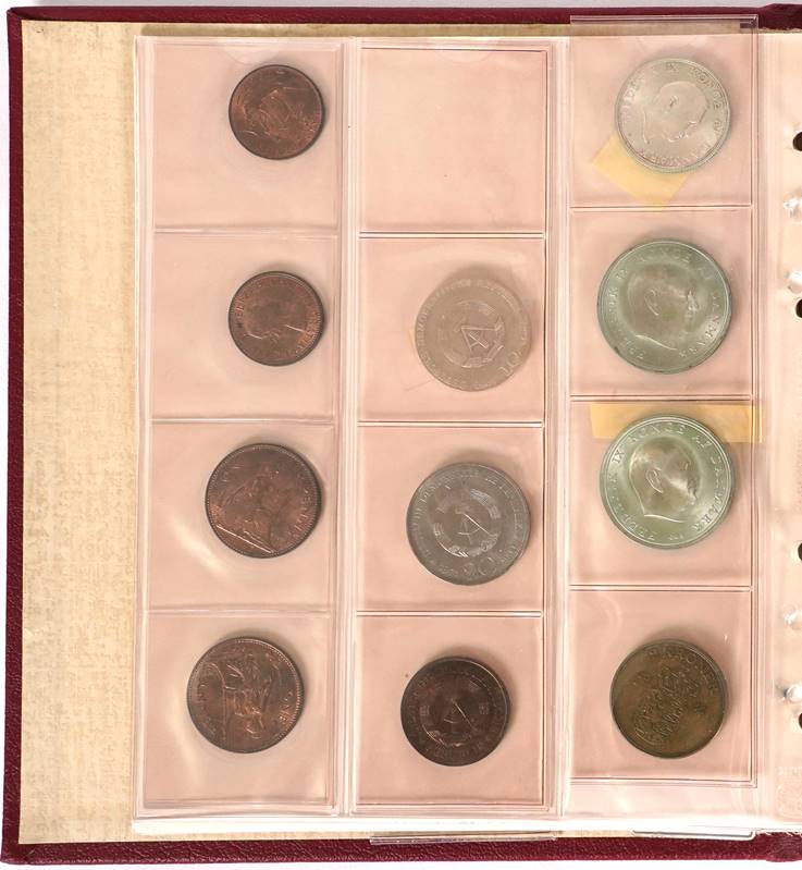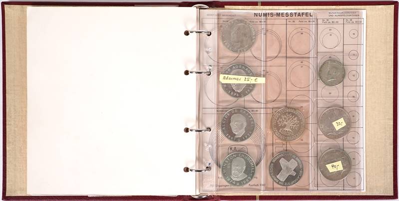 Konvolut Münzen in Münzalbum. 1 Blatt mit 8 x 100 Schilling, 1 Blatt mit 11 Münzen DDR, Dänemark etc. 1 Blatt mit 15 diversen Münzen Deutsches Reich, 1 Blatt mit 11 Silberadler und 1 Blatt mit 9 diverse Ecu Medaillen und amerikanische Münzen.