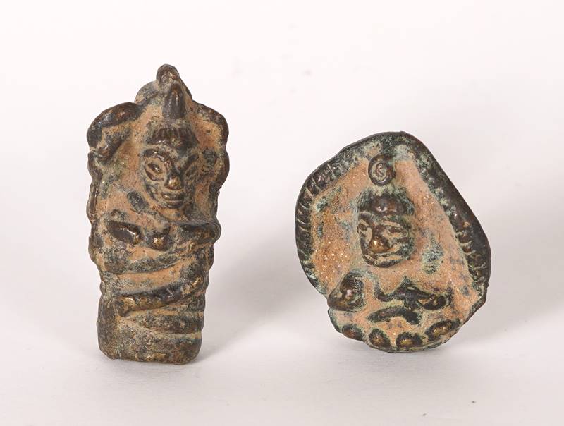 Wohl Asien 18./19. Jh. Metall, wohl Bronze. Beide Figuren verso mit Schlangenleib, vorne mit menschlichen Zügen. Eventuell Buddha Mucalinda mit Schlange Naga. Größe ca. 1,5/3 x 1,5/1,5 cm, Höhe ca. 4,5/3,5 cm, Gewicht ca. 27/20 Gramm. Altersbedingter Zustand wie abgebildet.