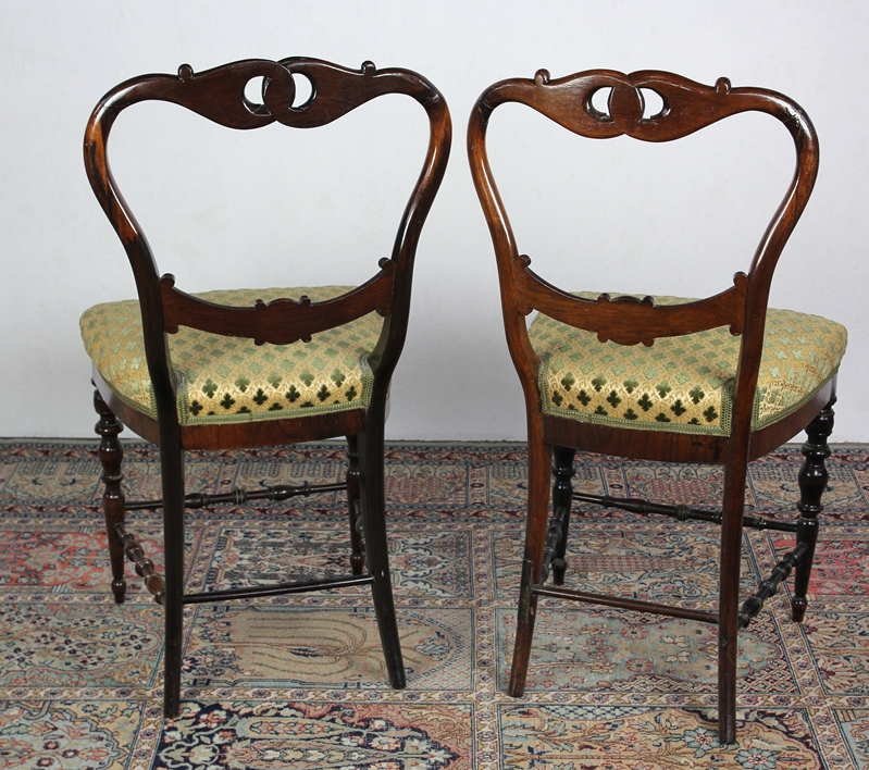 Paar englische Stühle Um 1900. Ebonisiertes Holz. Geschwungene Lehnen, mittig geschnitzt, gemustertes Polster auf gedrechselten Beinen mit ebenso gedrechselten Verstrebungen. Größe ca. 42 x 48 cm. Höhe ca. 87 cm, Sitzhöhe ca. 48 cm.