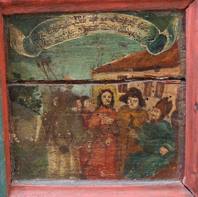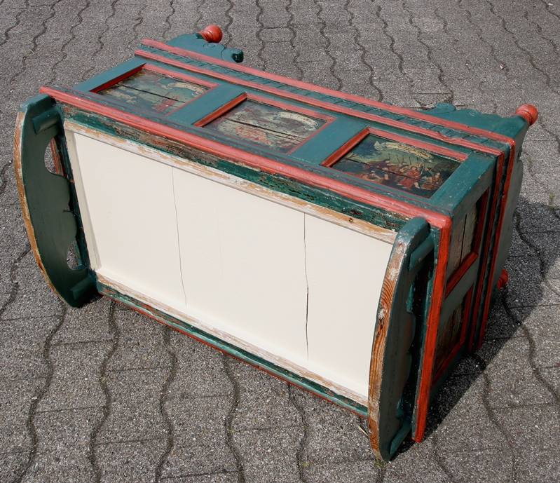 Barocke Kinderwiege Deutsch 18. Jh. Geschnitztes Holz, Blau und Rot gefasst. Zehn umlaufende, gemalte Szenen aus dem Leben Jesu. Größe ca. 50 x 87 cm, Höhe ca. 63 cm. Altersbedingter Zustand wie abgebildet.