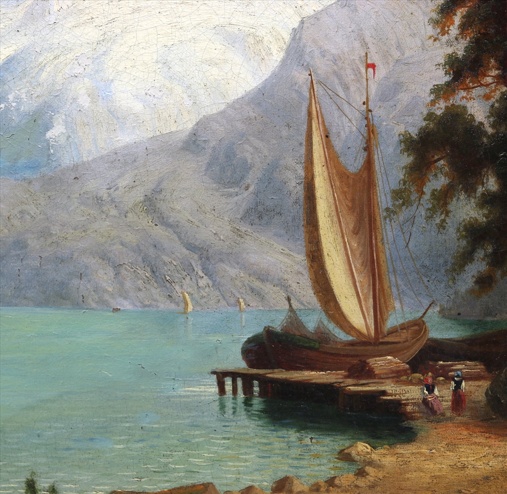1834 Paris - 1901 Barbizon. Urnersee mit Segelboot. Öl auf Leinwand. Verso bezeichnet und betitelt. Größe ca. 55 x 81,5 cm, Rahmen ca. 72 x 99,5 cm. Altersbedingter Zustand.