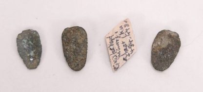 4 Ameisennasengeldstücke China 5. Jh. v. Chr. 4 Bronzemünzen sog. Ameisennasengeldstücke bzw. Geisterköpfe. Altes Sammleretikett. Mit Patina und berieben. Dazu ein behauener, quaderförmig mit chinesischen Schriftzeichen. Größe ca. 10 x 4 cm, Höhe ca. 2,5 cm.