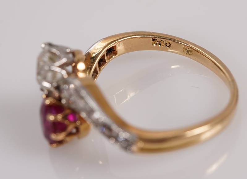 Deutsch 1960/70-er Jahre. Gelbgold 750 punziert und Meistermarke. Glatte Schiene mit sich nach oben teilendem Kopf besetzt mit einem Brillanten (Durchmesser ca. 5 mm, ca. weiß, ca. Pique) im Übergang und einem Rubin wohl behandelt. Beidseitig begleitet von insgesamt 10 Diamanten. Ringgröße ca.52, Gewicht ca. 3,5 Gramm. Schöner Zustand wie abgebildet.