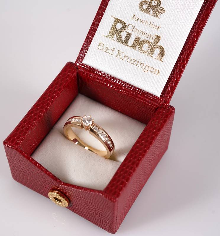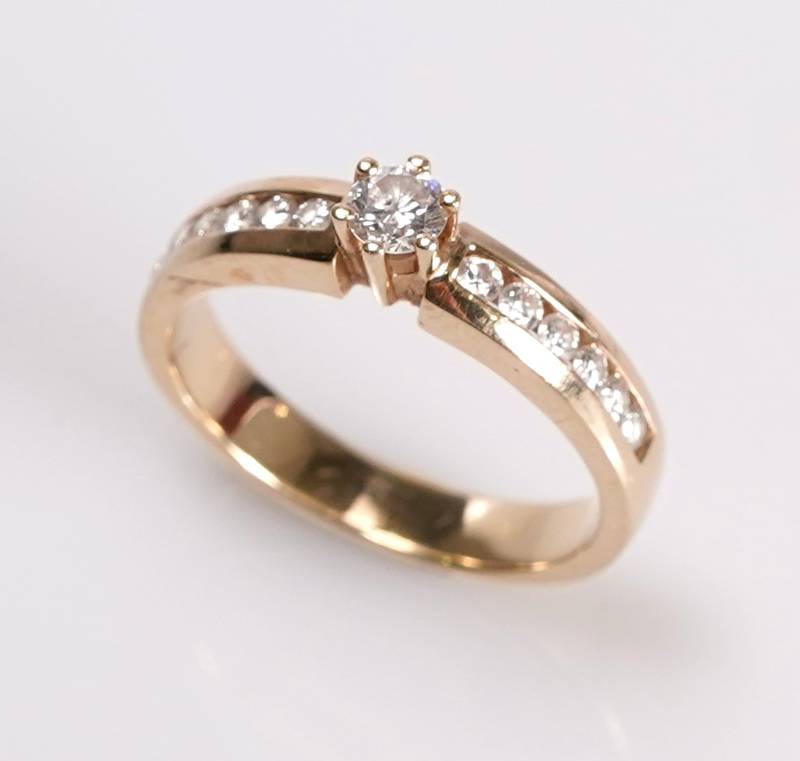 Brillantring Deutsch um 2000. Gelbgold 585 punziert. Breite Gelbgoldschiene zum Kopf hin seitlich mit je sechs Brillanten von zusammen ca. 0,3 Carat in Kanalfassung bestückt. In der Mitte ein Brillantsolitär von ca. 0,25 Carat, ca. weiß, ca. P1. Ringgröße ca. 20, Gewicht ca. 6 Gramm. Originale Schatulle Juwelier Ruch Bad Krozingen. Schöner Zustand wie abgebildet.