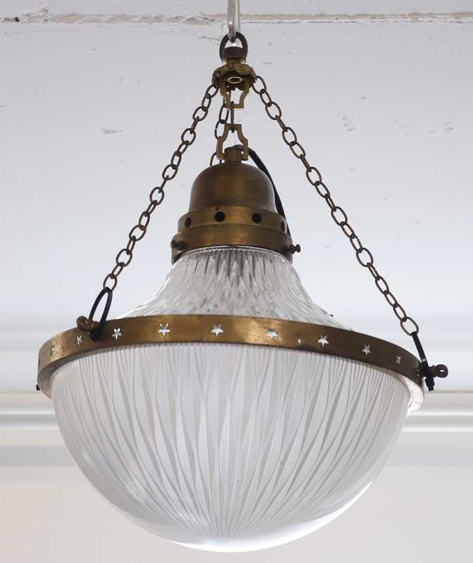Art Deco Deckenlampe Frankreich 1920er Jahre. Glas und Messing. Eine halbkugelförmige, innen mattierte und geschliffene Lampenschale, die über einen mit Sternen durchbrochenen Ring mit dem trichterförmigen Oberteil verbunden ist, welcher den gleichen Schliff auf der Außenseite aufweist. Durchmesser ca. 40 cm, Höhe ca. 43 cm. Bei den Kettenaufhängungen fehlen jeweils einige Glieder.