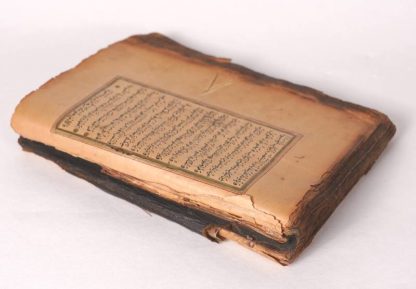 Islamische Handschrift Arabisch, wohl 18. Jh. Wohl Koran. Schwarze und rote Schrift, Verstrennungen in Gold, eingefasst mit vergoldeten Doppellinien, mit Rosettenweisern in Gold und Farbe. Schriftraum ca. 11 x 6,5 cm, Blatt ca. 16 x 11,5 cm. Einband fehlt, Seiten fehlen. Seiten teils stark beschädigt. Nicht auf Vollständigkeit geprüft. Zustand wie abgebildet, bitte selbst besichtigen.