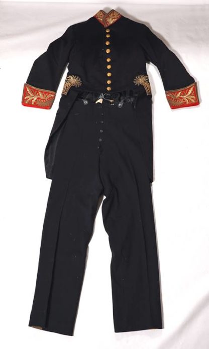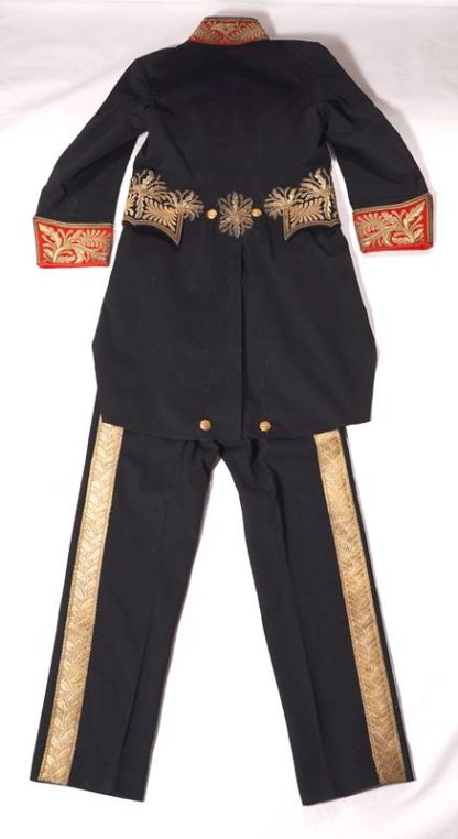 Wohl Galafrack mit Hose eines Angestellten des englischen Königshauses. Schwarzes Tuch mit rotem Kragen und Ärmelaufschlägen mit reichen Goldstickereien und Goldknöpfen mit Wappen. Länge des Fracks ca. 105 cm, Länge der Hose ca. 108 cm. Teils minimale Schäden.