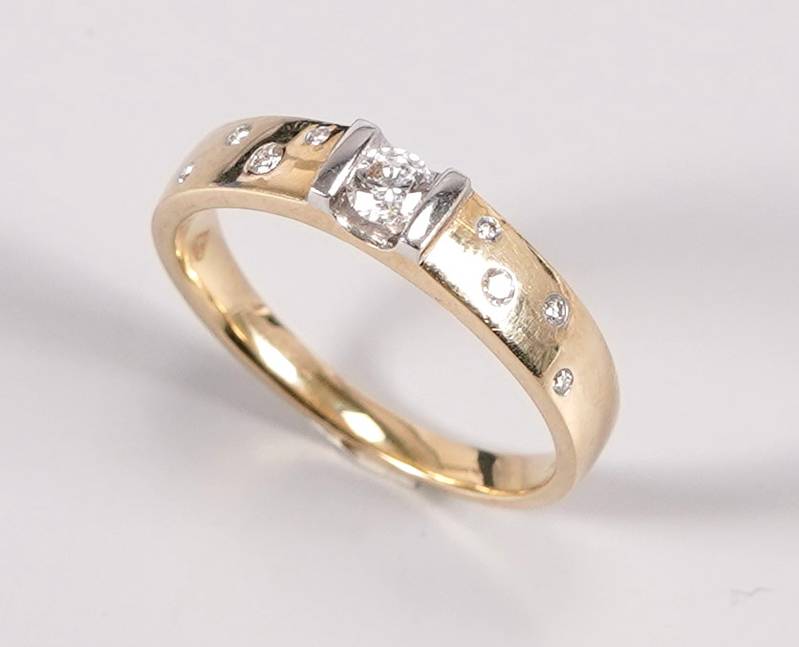 Brillantring Gold 585. Breite Ringschiene mit schauseitig acht eingesetzten Diamanten, welchen den Brillantsolitär ( ca. 0,2 Carat) einrahmen. In der Ringschiene punziert. Ringgröße ca. 64, Gewicht ca. 5,3 Gramm.