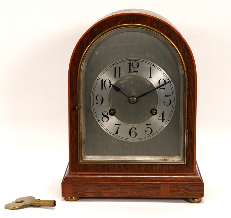 20. Jh. Holzkorpus auf vier Metallfüßen, oben rund abschließend mit Glastür schauseitig. Metallziffernblatt mit arabischen Ziffern. Uhrwerk mit Schlag zur halben und vollen Stunde auf Klangstange. Größe ca. 19,5 x 13 cm, Höhe ca. 26 cm. Läuft an, Schlag löst aus, Schlüssel anbei.
