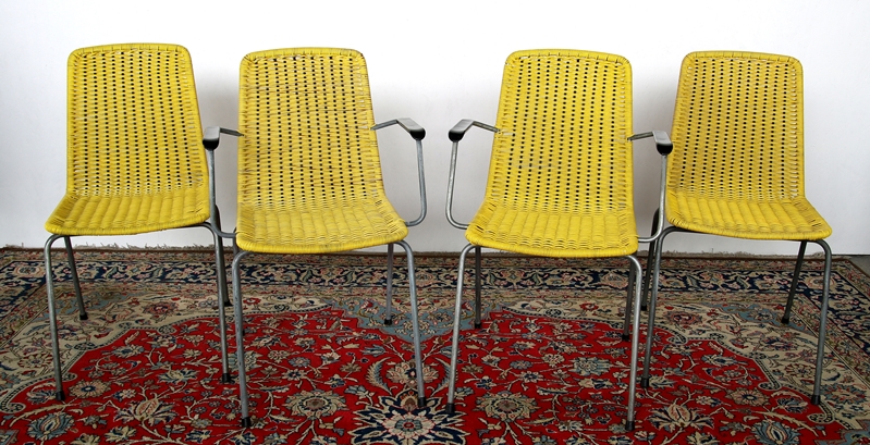 Vier Flechtstühle Deutsch 20. Jh. Rückenlehne sowie Sitzfläche aus gelbem gewebtem Kunststoff auf einer Metallkonstruktion. Zwei mit Armlehnen. Größe ca. 43 x 55 cm, Höhe ca. 82 cm, Sitzhöhe ca. 44 cm. Altersbedingte Patina.