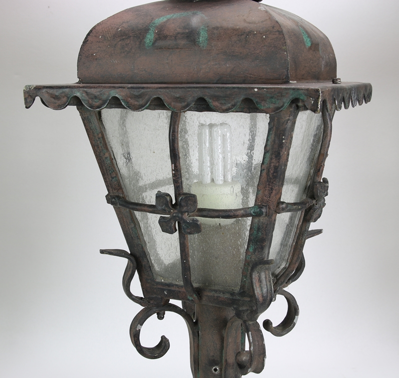 Deutsch 20. Jh. Metall. Viereckige Laterne mit Glasscheiben auf rundem Fuß mit Möglichkeit zur Befestigung am Boden. Elektrifiziert. Größe jeweils ca. 28 x 28 cm, Höhe ca. 65 cm. Gesamtgewicht ca. 28,5 kg. Teils berieben, nicht geprüft.
