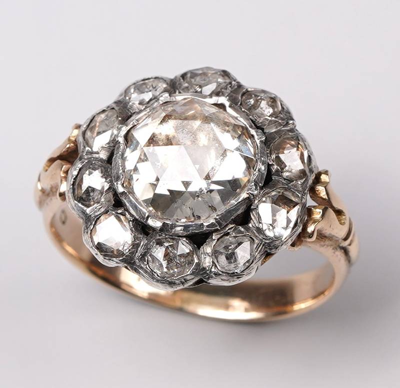 Kapitaler Diamantring Antiker Ring, wohl Österreich um 1900. Gelbgoldschiene und Verödung 585, undeutlich punziert. Großer Solitär im Rosenschliff, Durchmesser ca. 9,5 mm. Rundum von zehn Achtkantdiamanten begleitet. Ringgröße ca. 16,5, Gewicht ca. 4,8 Gramm. Schöner Zustand wie abgebildet.